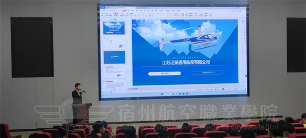 3月30日下午👩❤️👩,学院特邀江苏泛美通用航空有限公司张楠梃总经理✍🏼、严嘉成副总经理等一行4人来我院宣讲,主要对通航产业的现状、未来的发展以及江苏泛美通航的总体情况、报考条件和飞行项目进行了介绍👇。