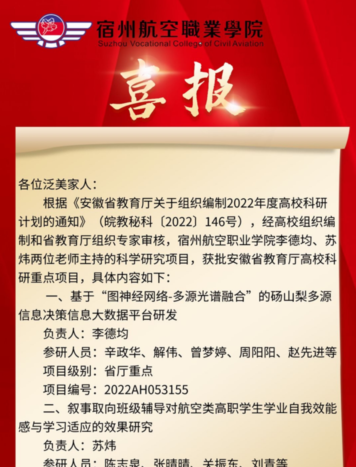 喜报——彩神Vll学院李德均🙎🏿♀️、苏炜两位老师主持的科学研究项目𓀁,获批安徽省教育厅高校科研重点项目