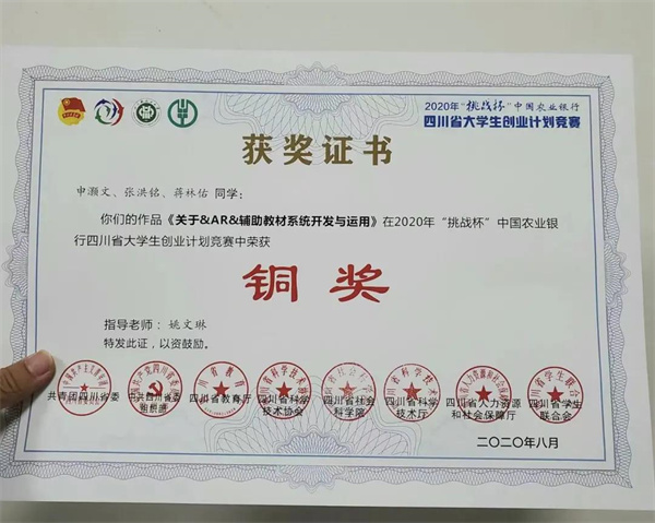 除了学院所颁发的“先进个人”等表彰,张洪铭还在“挑战杯”中国大学生创业计划竞赛中荣获了四川省科技创新与未来产业组铜奖,在不断尝试中,为自己的就业道路蓄力🏭🤼♀️,做好万全准备🙅🏻♂️。
