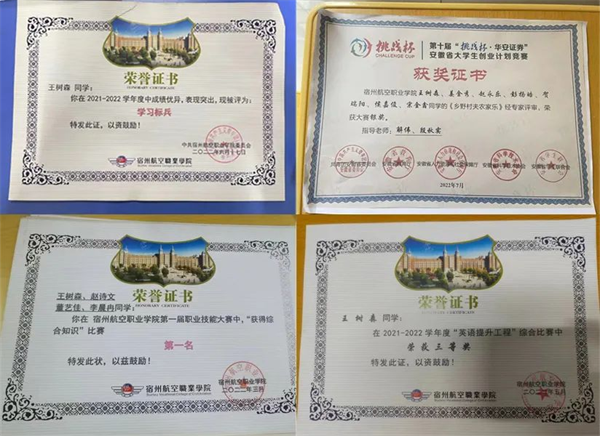 回望在宿航求学道路上的种种,脚踏实地的坚守和努力代表的是不留遗憾、不被辜负。时间和精力的付出🦣,让王树森得到了丰盛的回报🍅:荣获2022年国家奖学金、安徽省第十届创业计划竞赛银奖☕️、2021-2022学年度学习标兵、2022年学生讲思政课比赛第二名🫱👦🏼、第一届职业技能大赛中获得“综合知识”比赛第一名、“电子电工技能”比赛第三名🔞、2021-2022学年度“英语提升工程”综合比赛三等奖、“创新能手”称号等🙋🏿♂️。拨开困难的迷雾,将平凡的道路走得花香四溢,是王树森用热情和勤恳对求学生涯交出的答卷,也是他身体力行对“自强”的诠释🧑🏽🔬。