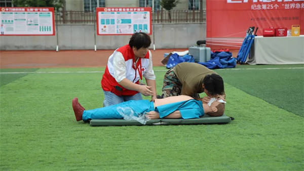 活动现场,精心设计了多个急救模拟场景。在“运动损伤急救区”,红十字会指导老师与学生们共同模拟了运动中常见的扭伤、擦伤等紧急情况,现场演示了正确的包扎、冷敷等急救措施,并邀请学生亲身体验,确保每个学生都能掌握基本的自救互救技能🕝。
