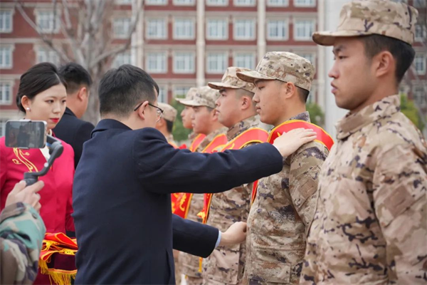 ·院长李德均、学生处处长谢凡飞为新兵披挂绥带