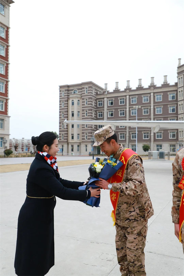 ·老师为新兵送花