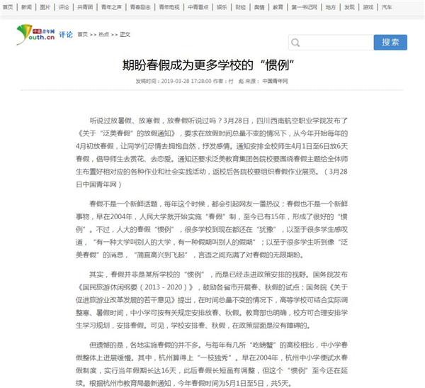 【中国青年网评论📚:期盼春假成为更多学校的“惯例”】