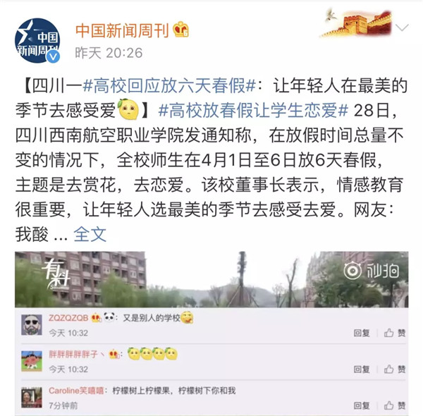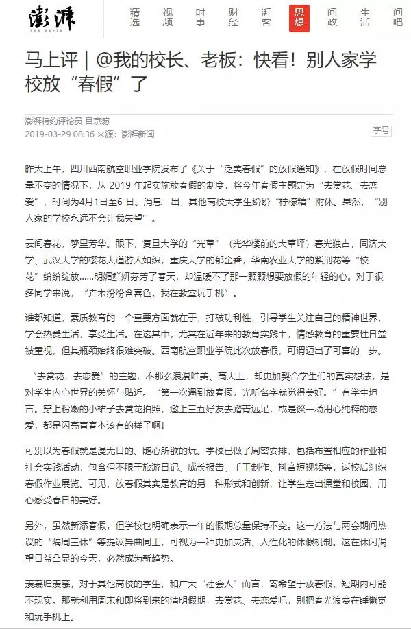 【澎湃评论🂠:马上评|@我的校长💃🏻、老板:快看💪🏼!别人家学校放“春假”了】