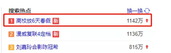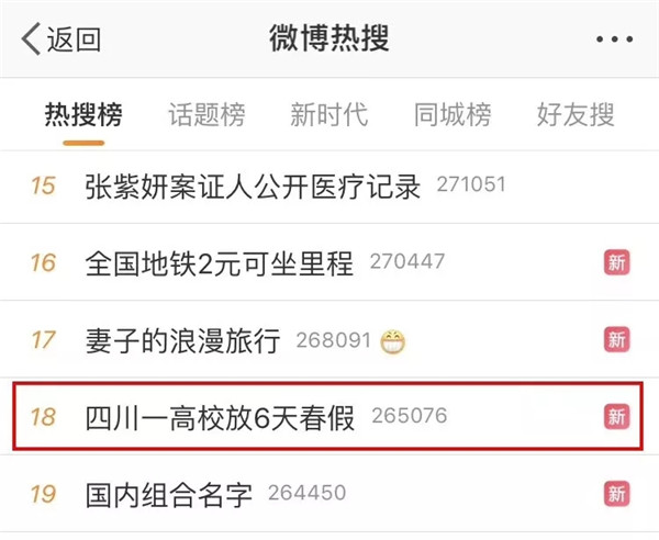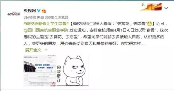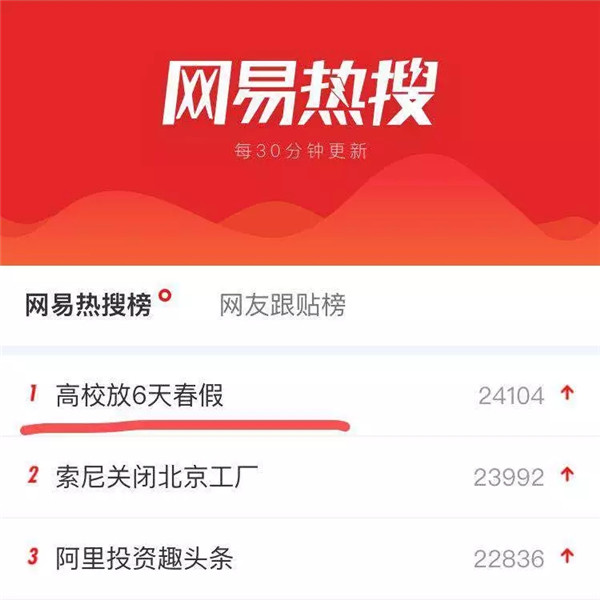 除此之外,在上网输入“高校”两个字,首先出来的就是“高校放6天春假”,可见“泛美春假”这个决定是多么的深得人心👂🏿。