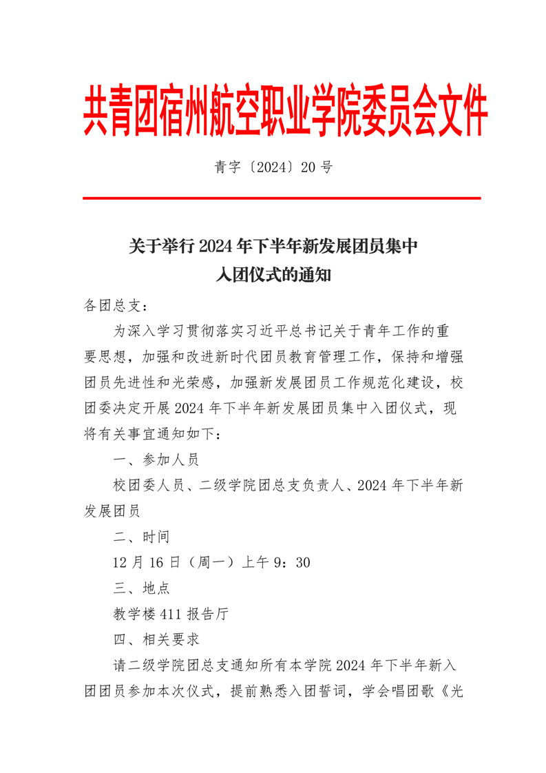 青字〔2024〕20号关于举行2024年下半年新发展团员集中入团仪式的通知