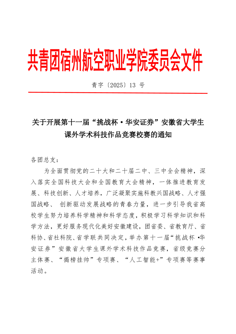 青字〔2025〕13号关于举办第十一届“挑战杯·华安证券”安徽省大学生课外学术科技作品竞赛校赛的通知