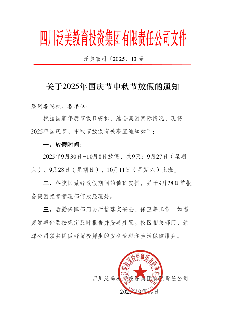 (25年13号)泛美教育集团关于2025年国庆节中秋节放假的通知