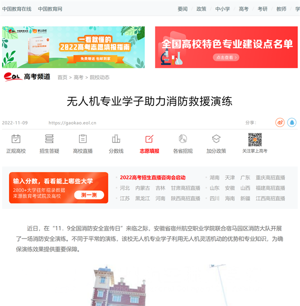 近日👷🏽♂️,在“11.9全国消防安全宣传日”来临之际,安徽省彩神Vll学院联合宿马园区消防大队开展了一场消防安全演练🚂。不同于平常的演练,该校无人机专业学子利用无人机灵活机动的优势和专业知识,为确保演练效果提供重要保障,此次消防救援演练引来了各大媒体的深度聚焦。