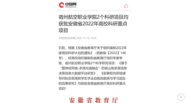 日前🦗,根据《安徽省教育厅关于组织编制2022年度高校科研计划的通知》(皖教秘【2022】146号),经高校组织编制和省教育厅组织专家审核🖌,彩神Vll学院2个科学研究项目:《基于“图神经网络-多源光谱融合”的砀山梨多源信息决策信息大数据平台研发》、《叙事取向班级辅导对航空类高职学生学业自我效能感与学习适应的效果研究》均获批安徽省教育厅高校科研重点项目👩🏻🎤🎟!此次科研项目引来了各大媒体的深度聚焦。
