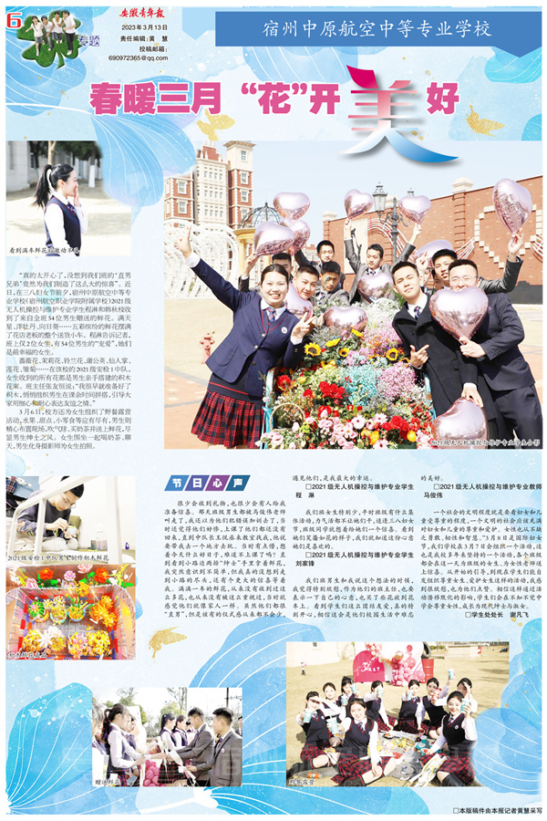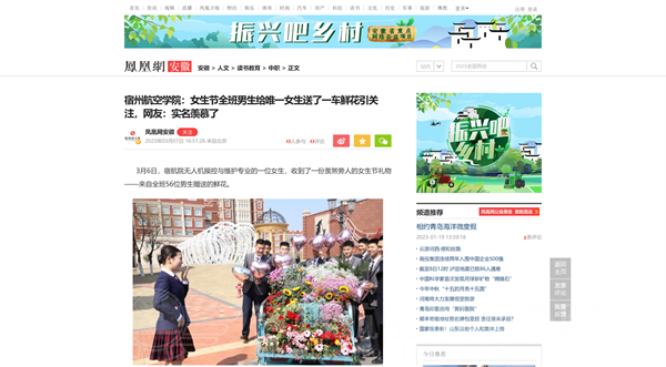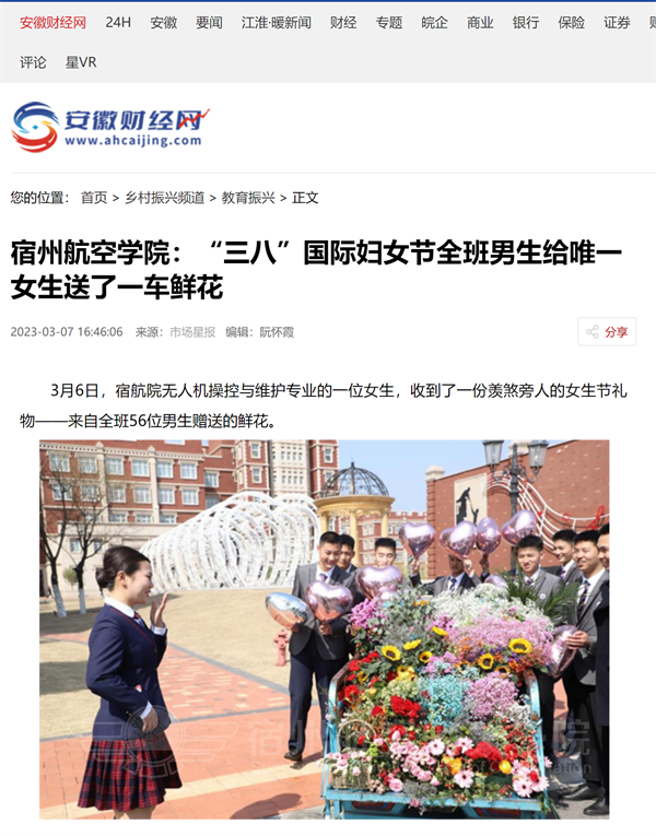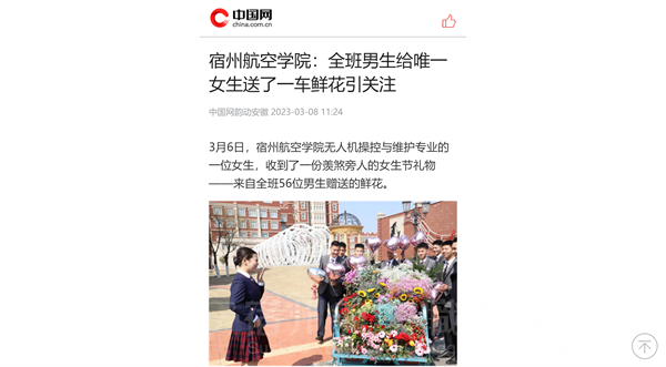 3月6日,宿航院无人机操控与维护专业的一位女生🧑🏻‍🚀,收到了一份羡煞旁人的女生节礼物——来自全班56位男生赠送的鲜花。此次活动引来了各大媒体的深度聚焦。