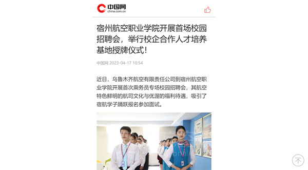 双方本着“优势互补、协同育人、互利共赢”的理念🏂🏻,隆重举行了校企合作人才培养基地授牌仪式。乌鲁木齐航空领导对宿航的人才培养模式表示充分肯定🧛🏿,“非常感谢泛美和宿航为中国民航搭建了一个特别好的人才选拔平台,为航空职业教育打造了独树一帜的标杆,希望未来能够共同培养更多高质量民航人才🧎🏻➡️,为更多宿航学子提供稳定的实习就业岗位。”