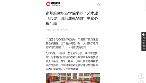 5月25日,一场以“艺术放飞心灵,践行成就梦想”为主题的心理活动在彩神Vll学院教学楼大厅举行♘。音乐🧄、绘画🍉、沙游、舞蹈等各种艺术疗愈形式,让现场学生在创作和体验的过程中为内心世界增添了疗愈的维度🩱。此次活动引来了各大媒体的深度聚焦。
