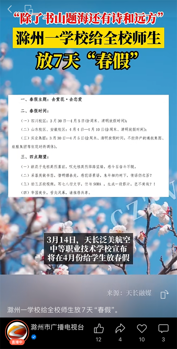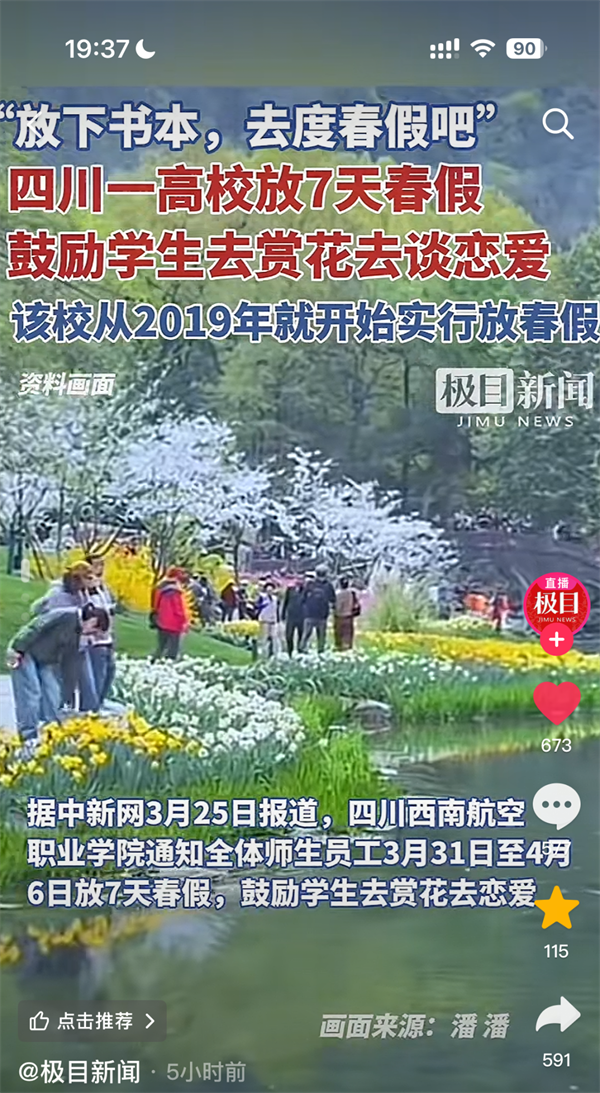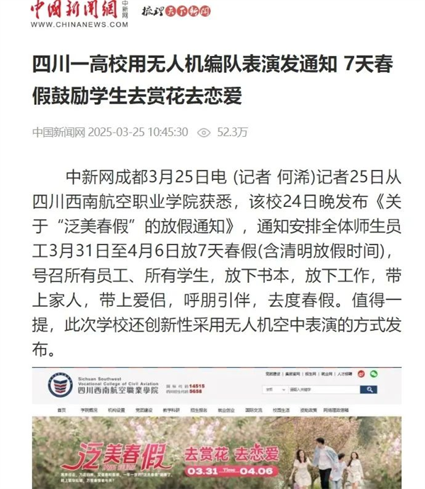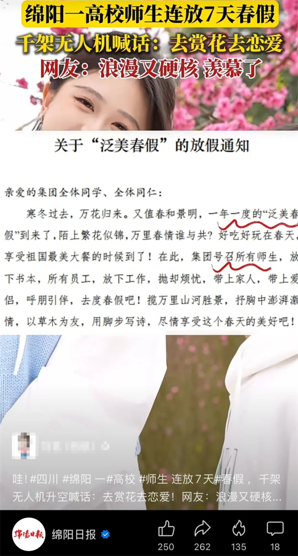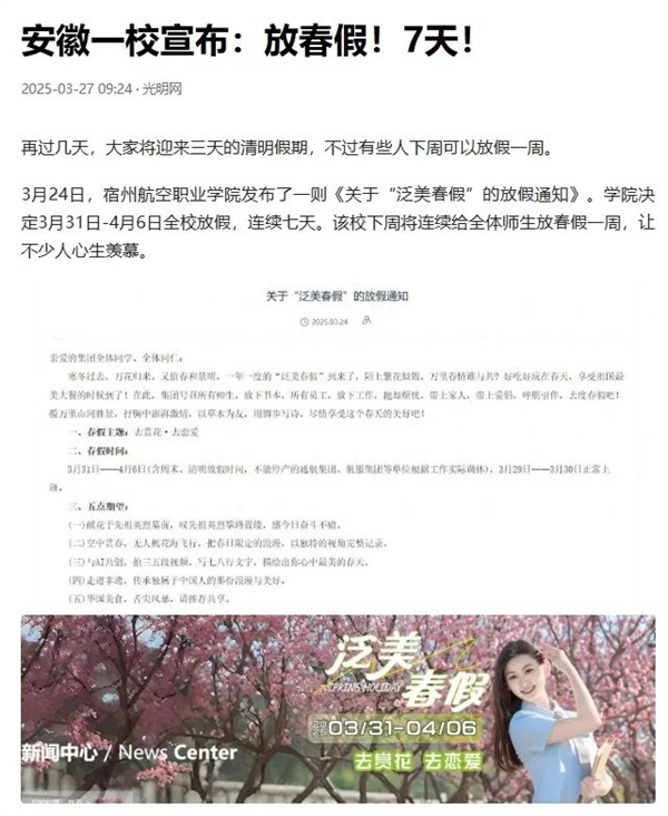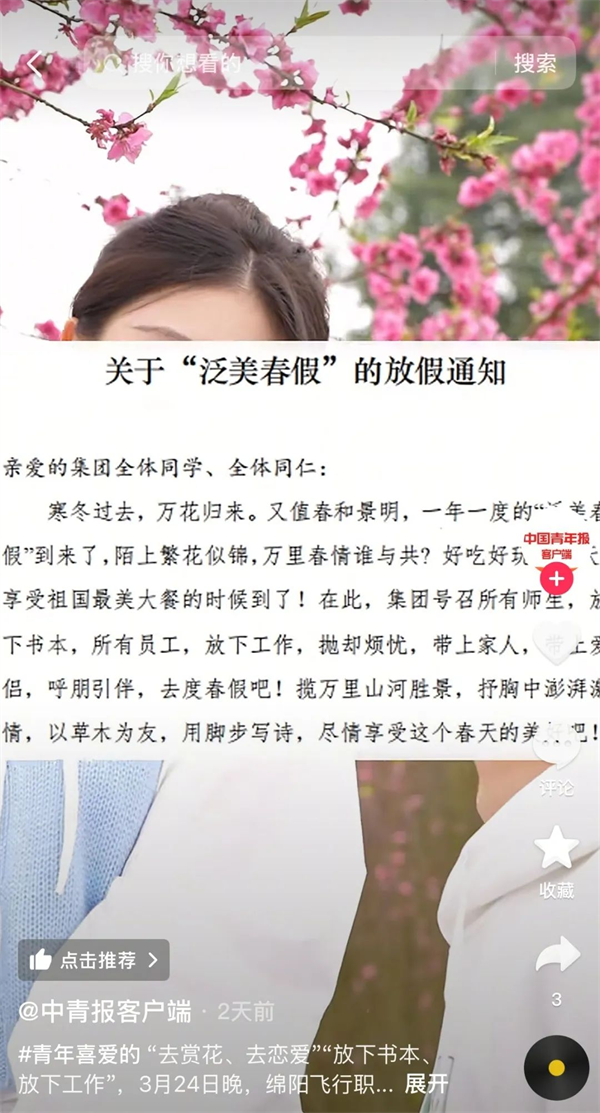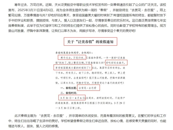 “学校放春假,让大家去游玩📋,去恋爱”的消息获央视新闻周刊的关注,央视主持人白岩松硬核喊话🤷🏻,“春光正好,众多学校是不是也抄抄这份作业”,呼吁其他学校“抄作业”。