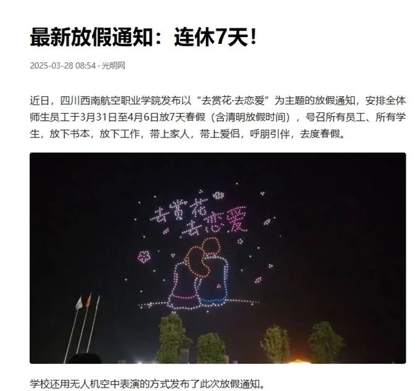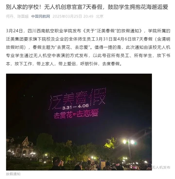 别人家的大学👍,又双叒叕放春假了!“学校通过无人机专业学生⏪,通过无人机表演发布放假通知,既秀了专业实力,又狂撒青春糖分🧑🏻🦳,本身就是一堂‘硬核实践课’。会操作无人机的技术咖,懂赏花恋爱的有趣灵魂😡,正是时代需要的复合型人才↙️。”