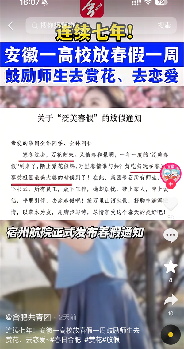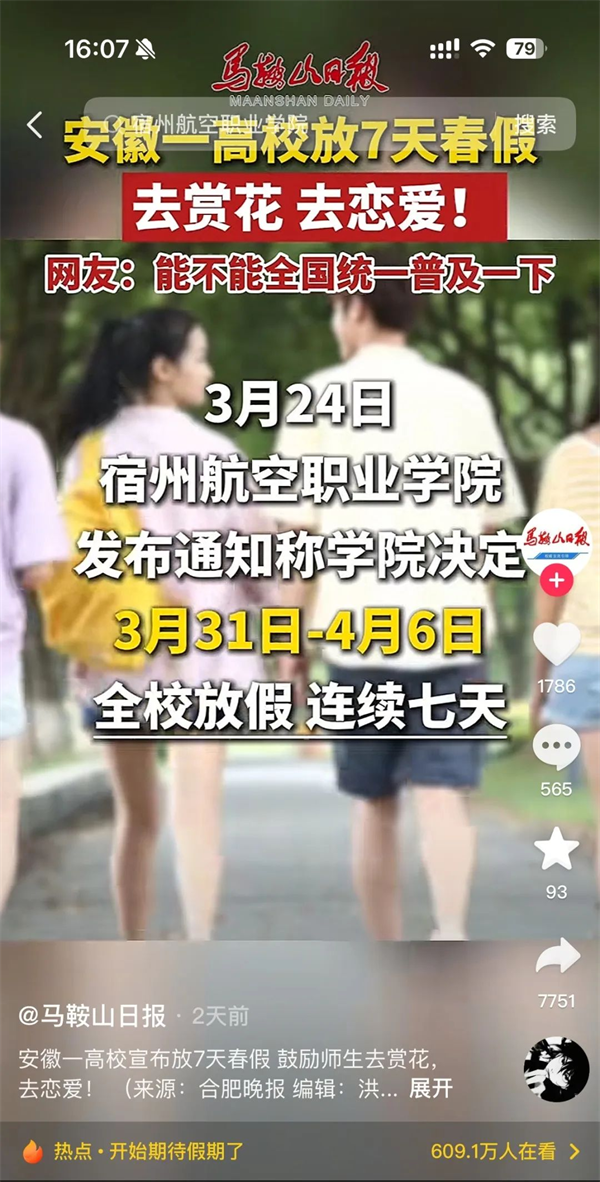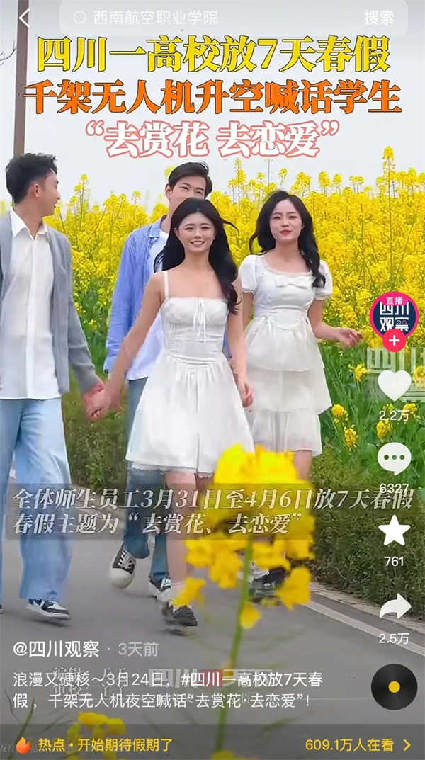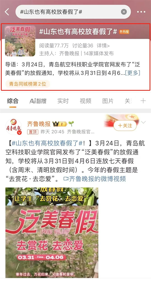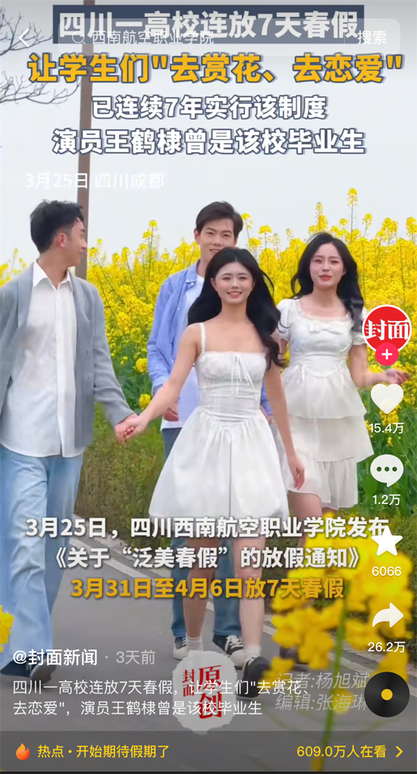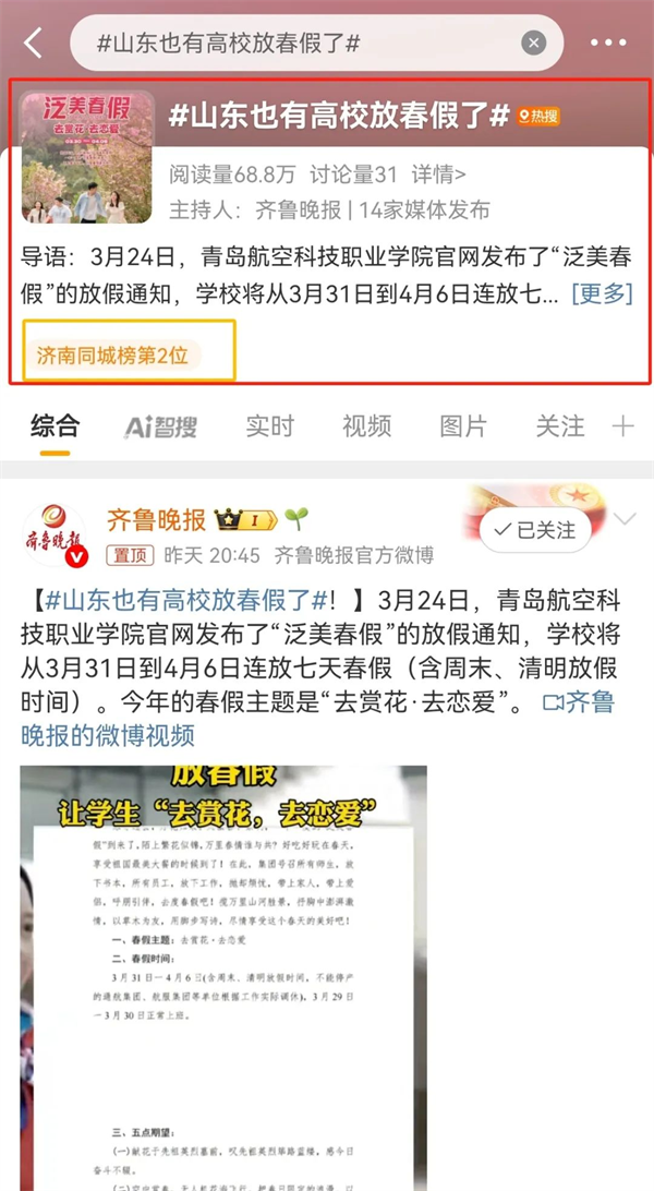 “泛美春假”“高校放7天春假鼓励赏花恋爱”的话题,持续发酵,在多个新闻客户端的头条推送❣️、还登上了各地区抖音🏑、微博🕵🏼♂️、微信搜索等实时热度榜单……
