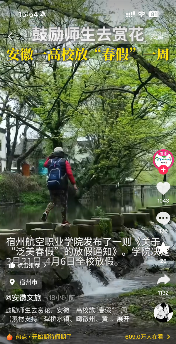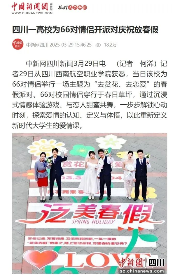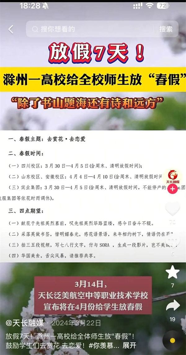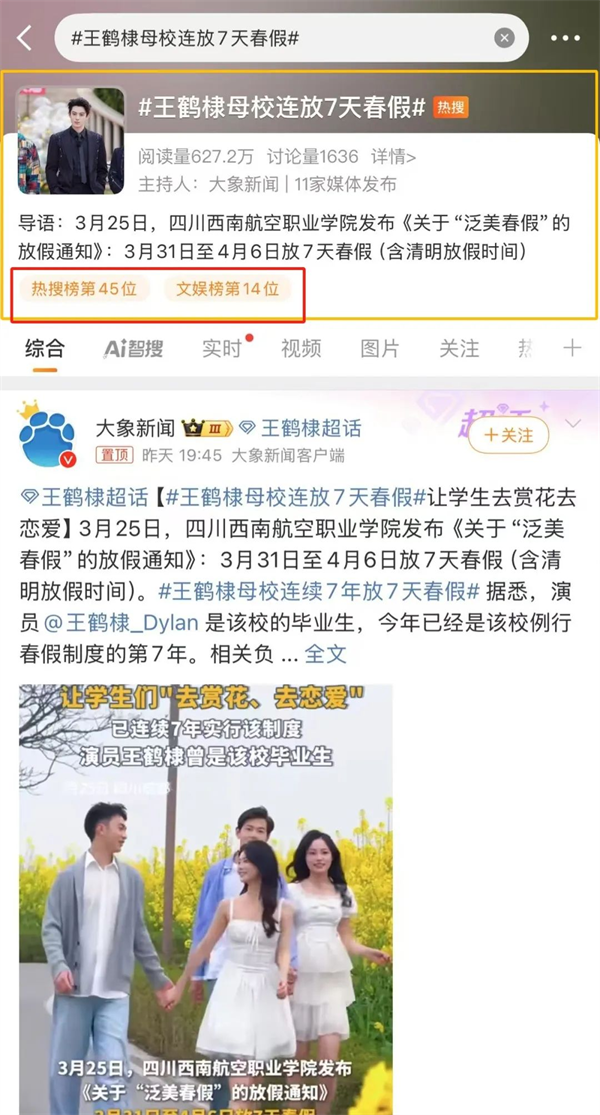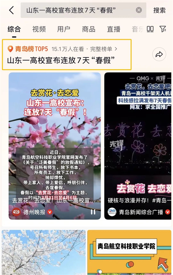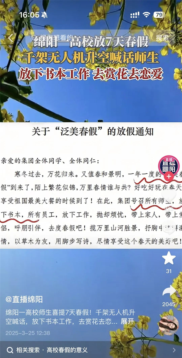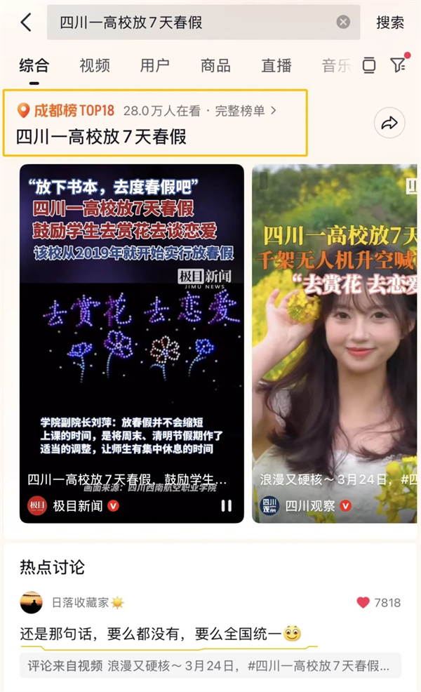 “泛美春假”“高校放7天春假鼓励赏花恋爱”的话题,持续发酵,在多个新闻客户端的头条推送❣️、还登上了各地区抖音🏑、微博🕵🏼♂️、微信搜索等实时热度榜单……