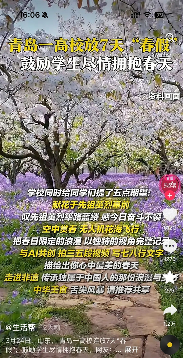 共青团山东省委官方公众账号青春山东头条转发“羡慕了!山东一高校宣布连放7天‘春假’”。