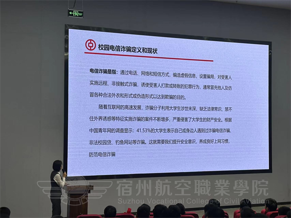中国银行宿州分行经理从防范校园电信诈骗👨🏿⚖️、远离非法校园贷、珍爱个人征信🌱、断卡行动四个方面的进行具体阐述👨❤️👨,通过列举身边的案例,进一步增强同学们的反诈意识🧜🏽,引导同学们关注自身信用记录。