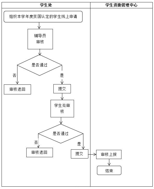 | 2.线上审核 | 学生在线申请后学生处须审核学生在线填报的所有数据,申报贫困等级必须按照公布的等级进行填写🧑🦯➡️,在建档立卡选项处需特别注意,应根据学院公示名单确认,未在公示的名单内一律选“否”。学生信息有误的🧘🏽♂️,审核退回并重新填写,或者审核不通过👣。 | 学生处 |