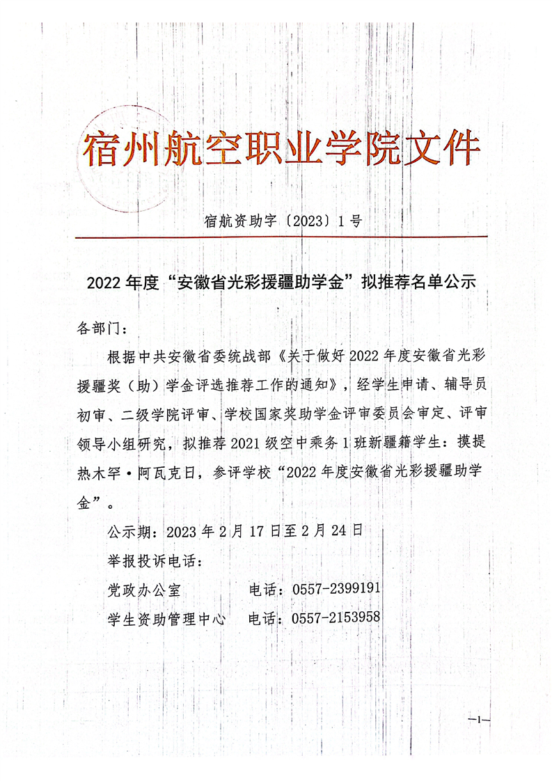 2022年度“安徽省光彩援疆助学金”拟推荐名单公示