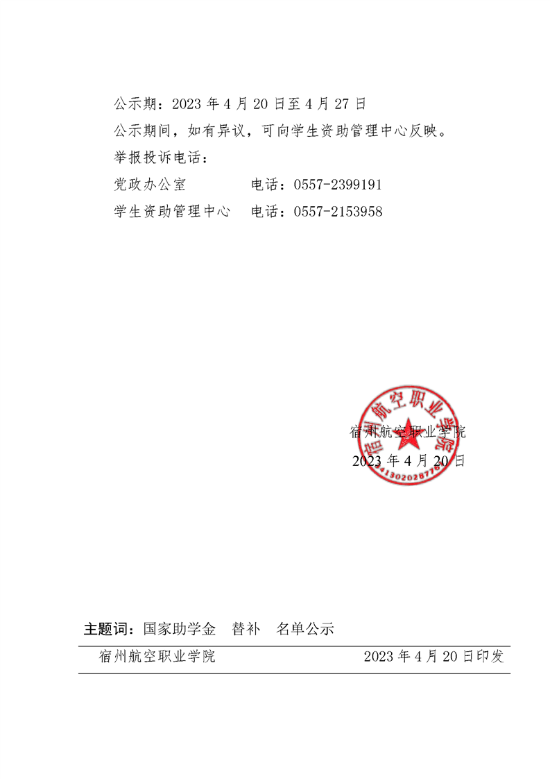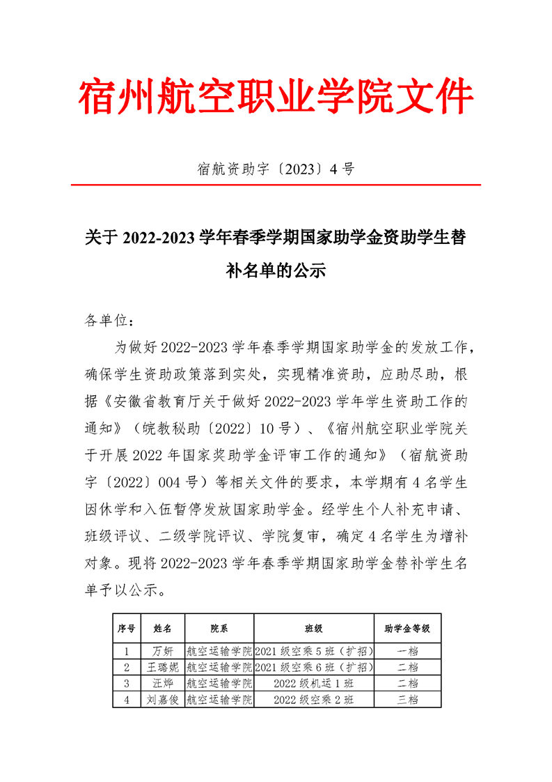 关于2022-2023学年春季学期国家助学金资助学生替补名单的公示