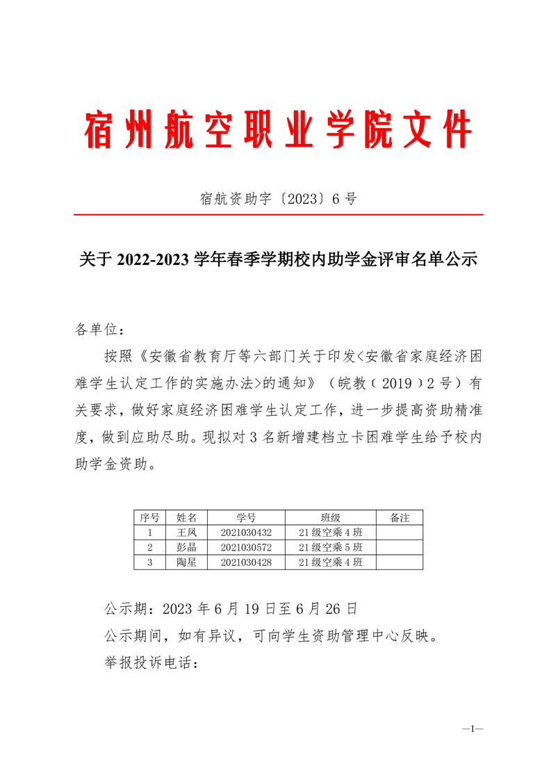 关于2022-2023学年春季学期校内助学金评审名单公示