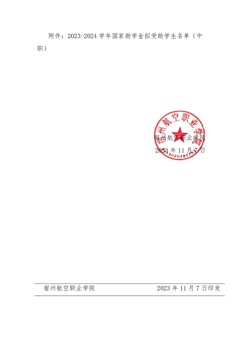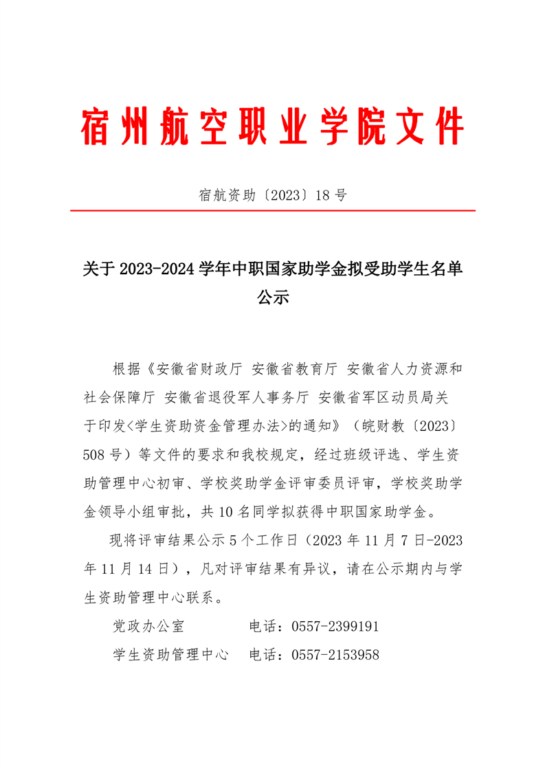 关于2023-2024 学年中职国家助学金拟受助学生名单公示