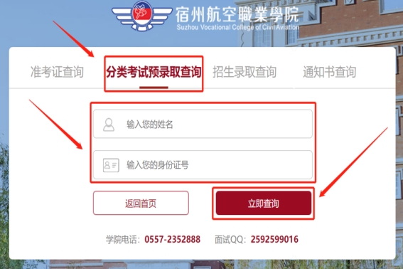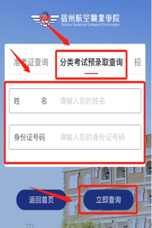2.进入后点击“分类考试预录取查询”,根据提示填写“姓名”及“身份证号码”,填写正确后🗼,点击下方“立即查询”👨🏽;