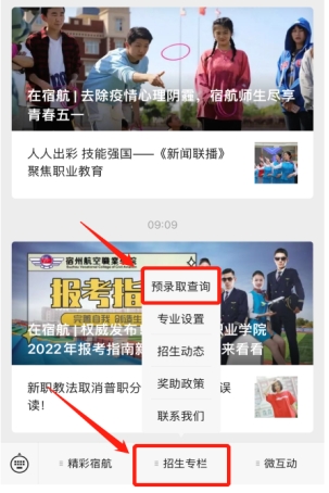 2.进入公众号后点击下方“招生专栏”🦸🏻,之后点击上方“预录取查询”,进入查询页面;