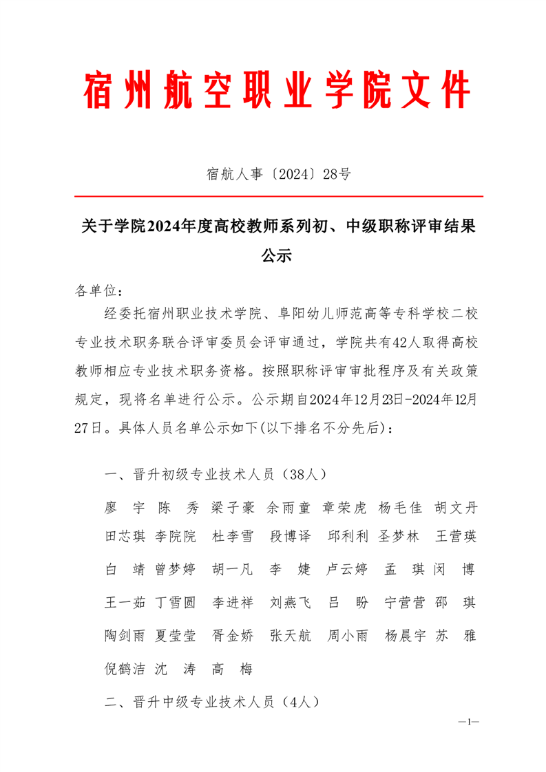 关于学院2024年度高校教师系列初、中级职称评审结果 公示