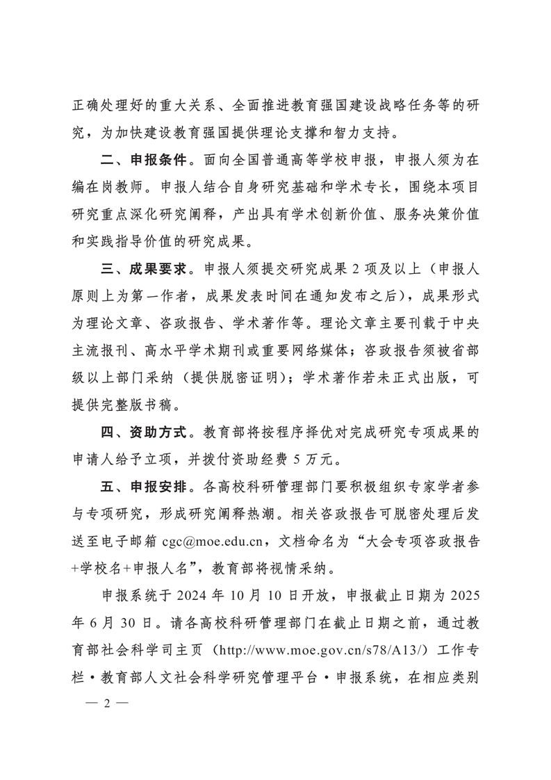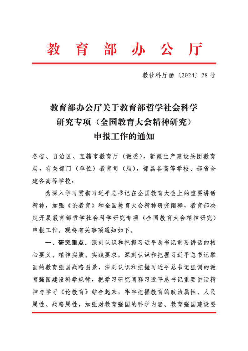 教育部办公厅关于教育部哲学社会科学研究专项(全国教育大会精神研究)申报工作的通知