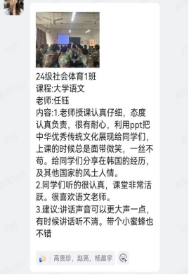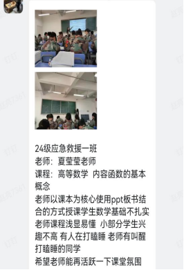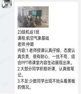 本学期是学院迎评促建的关键节点,院督导委员会强化评估意识和教学质量意识,创新学生教学信息员教学质量监督工作方式,组建了24-25学年度院级教学信息员钉钉群,建议学生信息员以“照片+简短评述”的方式对教师课堂教学进行评价,院督导委员会及时收集信息反馈给相关部门和任课教师整改。学生信息员积极踊跃,反馈了大量教师课堂教学第一手信息🧣,反映了学生愿望与需求、在帮助教师改善教学效果、加强教学管理等方面发挥了积极作用。