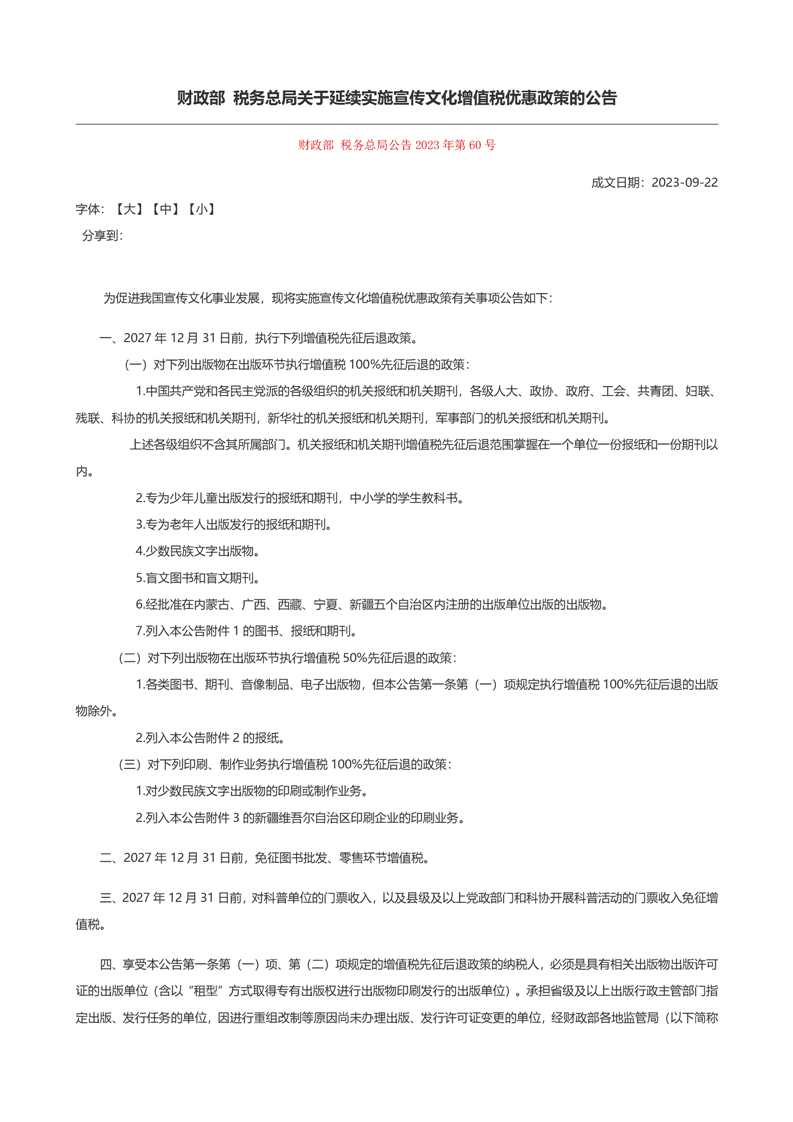 财政部 税务局关于延续实施宣传文化增值税优惠政策的公告
