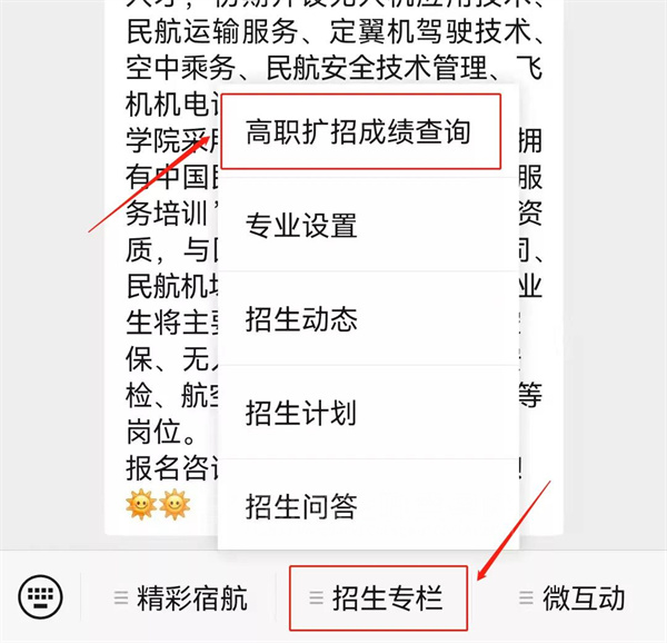进入公众号后点击“招生专栏”🪼,点击上方“高职扩招成绩查询”。