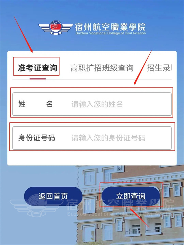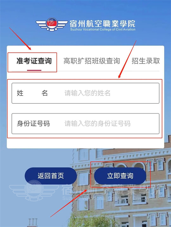 2.进入后点击“准考证查询”,根据提示填写“姓名”及“身份证号码”👨🏼⚖️,填写正确后,点击下方“立即查询”🚴🏿♀️🌴,即可查看准考证;