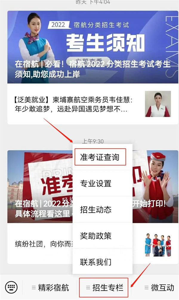 2.进入公众号后点击下方“招生专栏”🎲🐪,之后点击上方“准考证查询”,进入准考证查询页面;