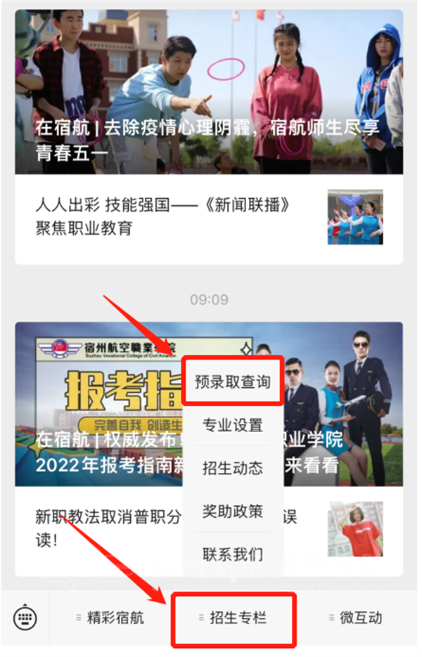 2.进入公众号后点击下方“招生专栏”,之后点击上方“预录取查询”,进入查询页面🐕;