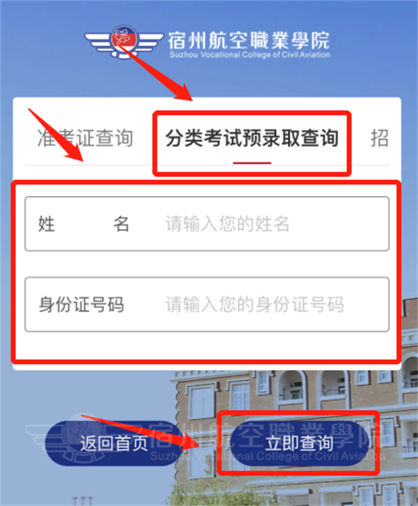 2.进入后点击“分类考试预录取查询”,根据提示填写“姓名”及“身份证号码”,填写正确后,点击下方“立即查询”🔗👨👦;