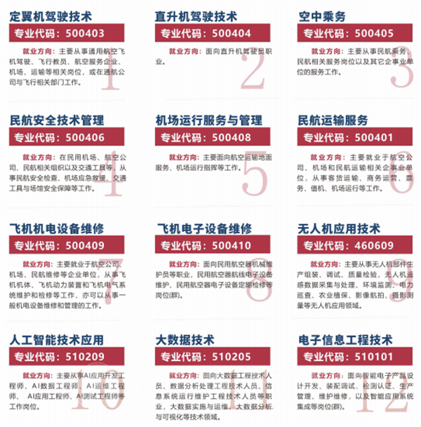 学院立足安徽⛓️💥、面向长三角🙃🧖🏿、服务航空产业,培养高素质技术技能型人才,开设无人机应用技术、直升机驾驶技术、定翼机驾驶技术🧚🏿♀️、空中乘务🚷、民航安全技术管理、飞机机电设备维修🂠、机场运行服务与管理🖋、人工智能技术应用、网络营销与直播电商等十五大专业。