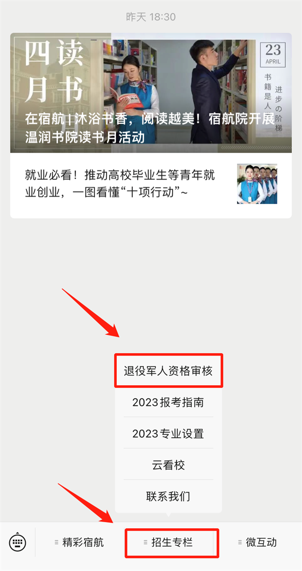 2.进入公众号后点击“招生专栏”😻,点击上方“退役军人资格审核”;