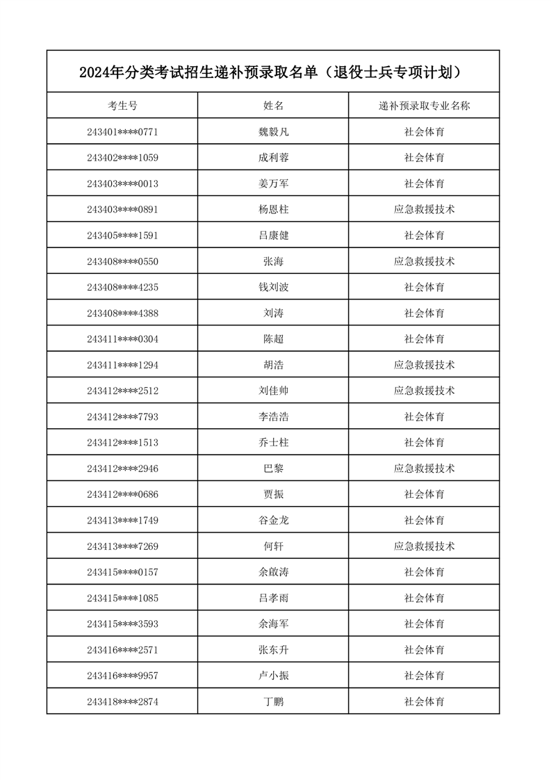 彩神Vll学院2024年分类考试招生递补预录取名单(退役士兵专项计划)