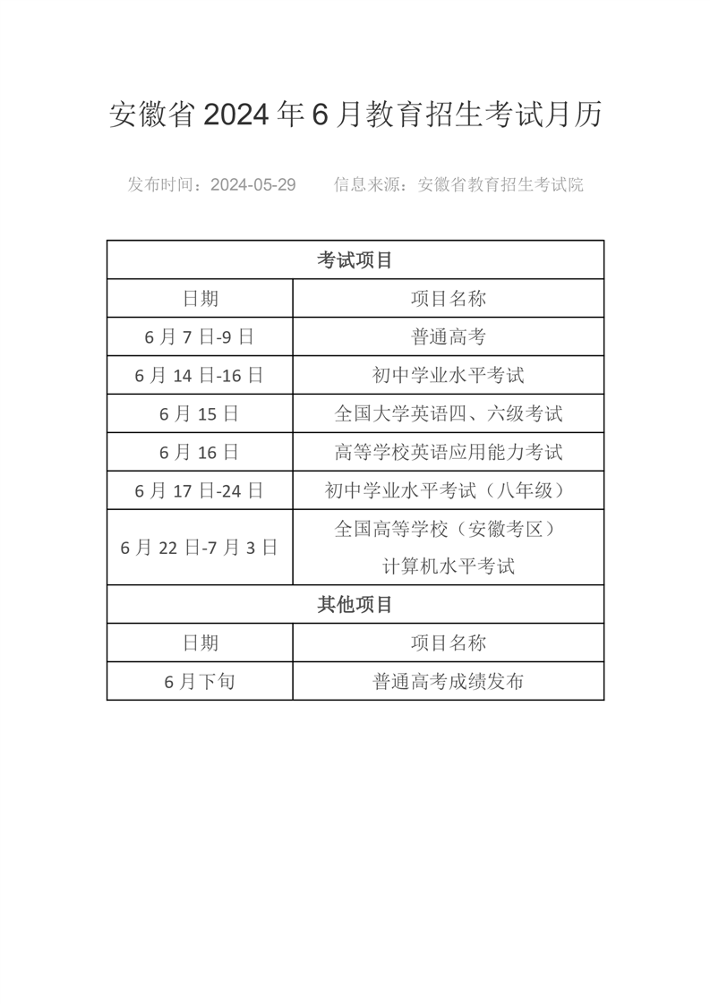 安徽省2024年6月教育招生考试月历