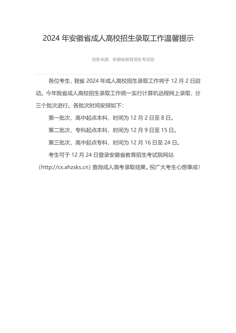 2024年安徽省成人高校招生录取工作温馨提示