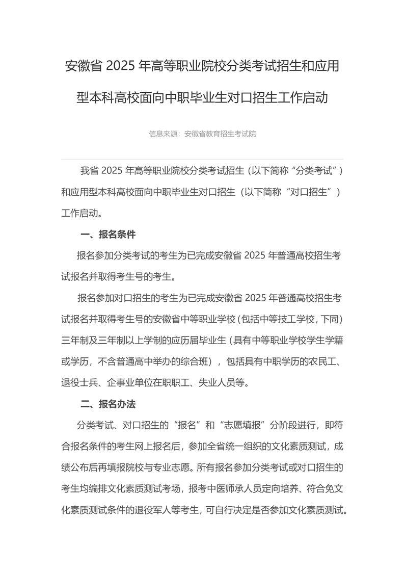 安徽省2025年高等职业院校分类考试招生和应用型本科高校面向中职毕业生对口招生工作启动