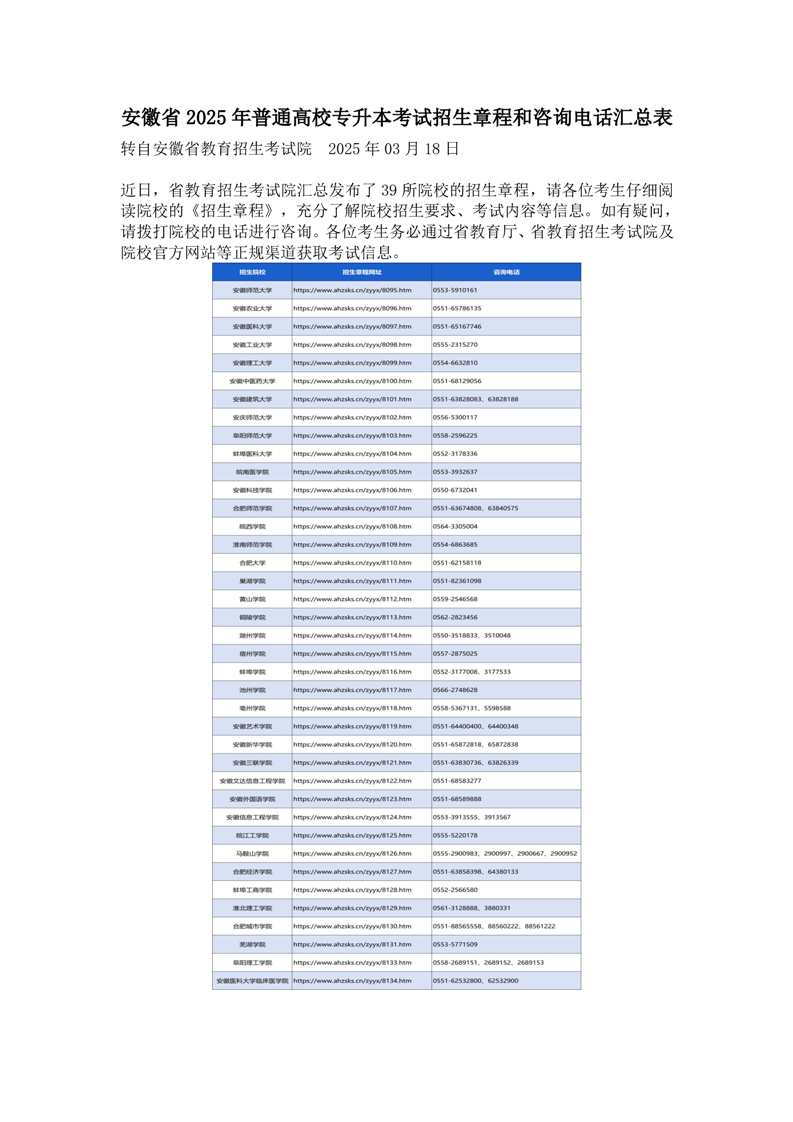 安徽省2025年普通高校专升本考试招生章程和咨询电话汇总表