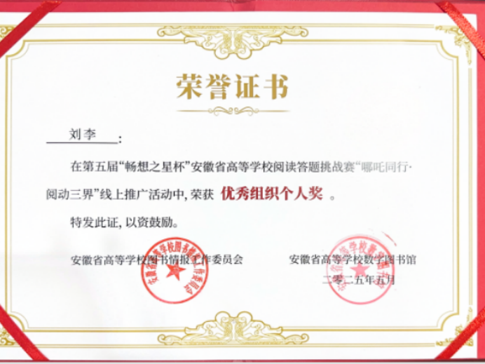 2025年3—6月🧑🏻‍🤝‍🧑🏻,由安徽省高校图工委联合畅想之星平台共同主办,以“哪吒同行·阅动三界—阅读积分挑战赛”为主题的答题挑战赛落下帷幕。本次大赛旨在推动高校师生深入利用数字资源🔨,培养终身阅读习惯👩‍🎓。活动涵盖在线打卡、阅读积分等多元形式🚞,共计吸引了安徽省83家图书馆、5794名师生参与。我校图书馆凭借出色的组织工作和师生的积极参与🐋,荣获“阅读推广优秀组织单位”;刘李老师表现优异获得“优秀组织个人奖”👳🏽。