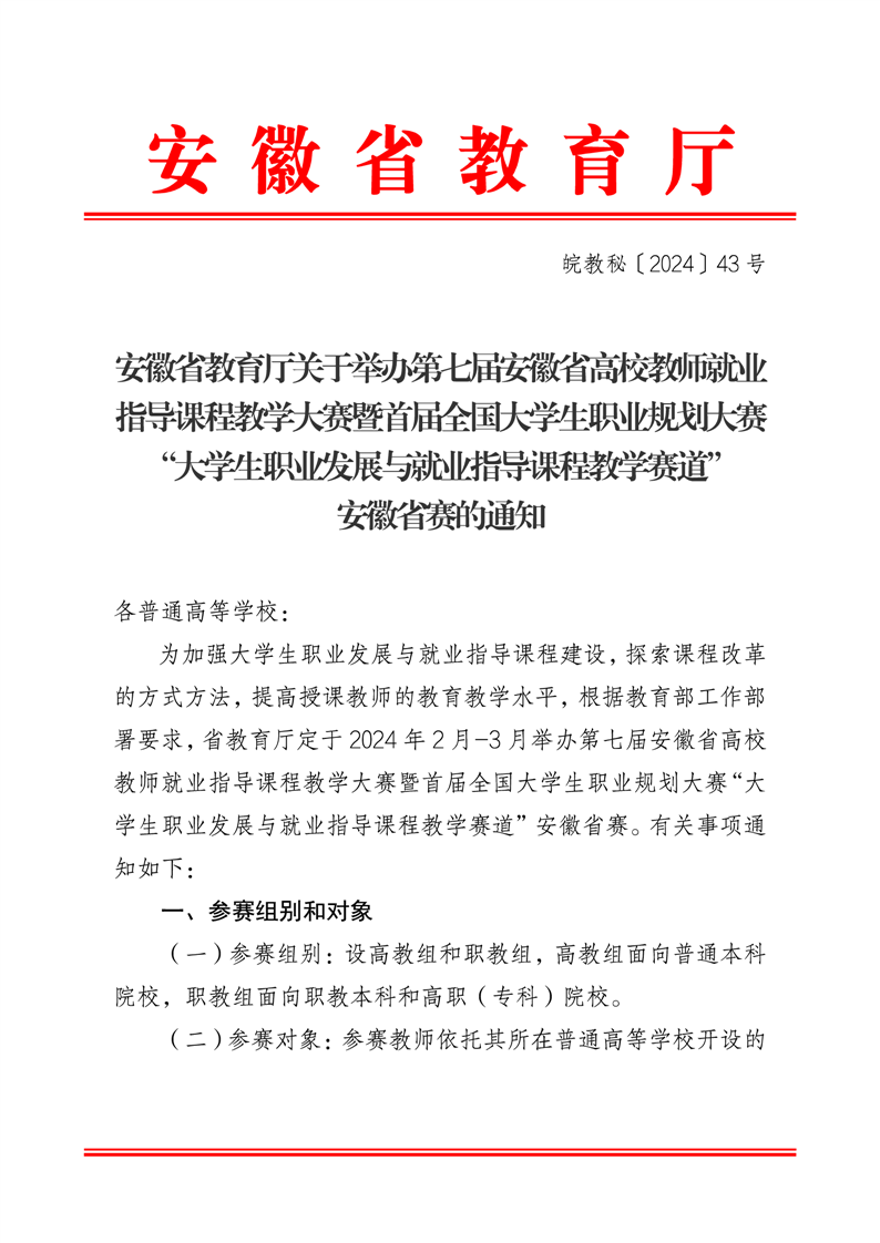 安徽省教育厅关于举办第七届安徽省高校教师就业指导课程教学大赛暨首届全国大学生职业规划大赛“大学生职业发展与就业指导课程教学赛道”安徽省赛的通知