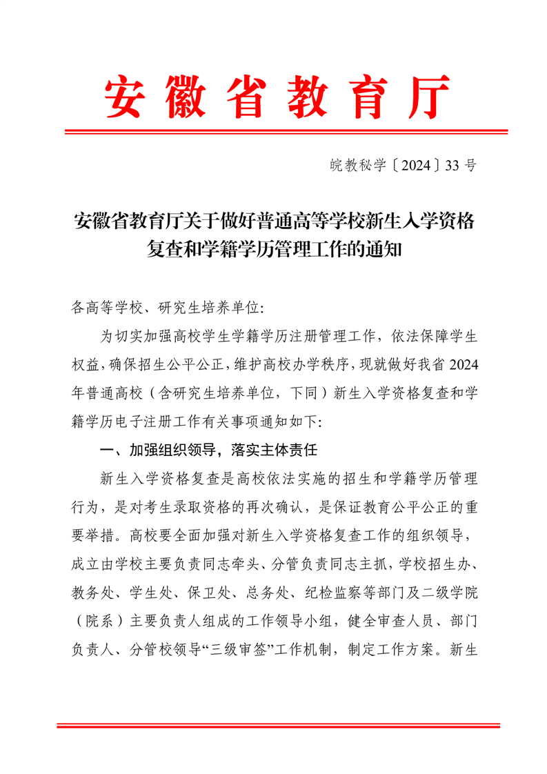 安徽省教育厅关于做好普通高等学校新生入学资格复查和学籍学历管理工作的通知
